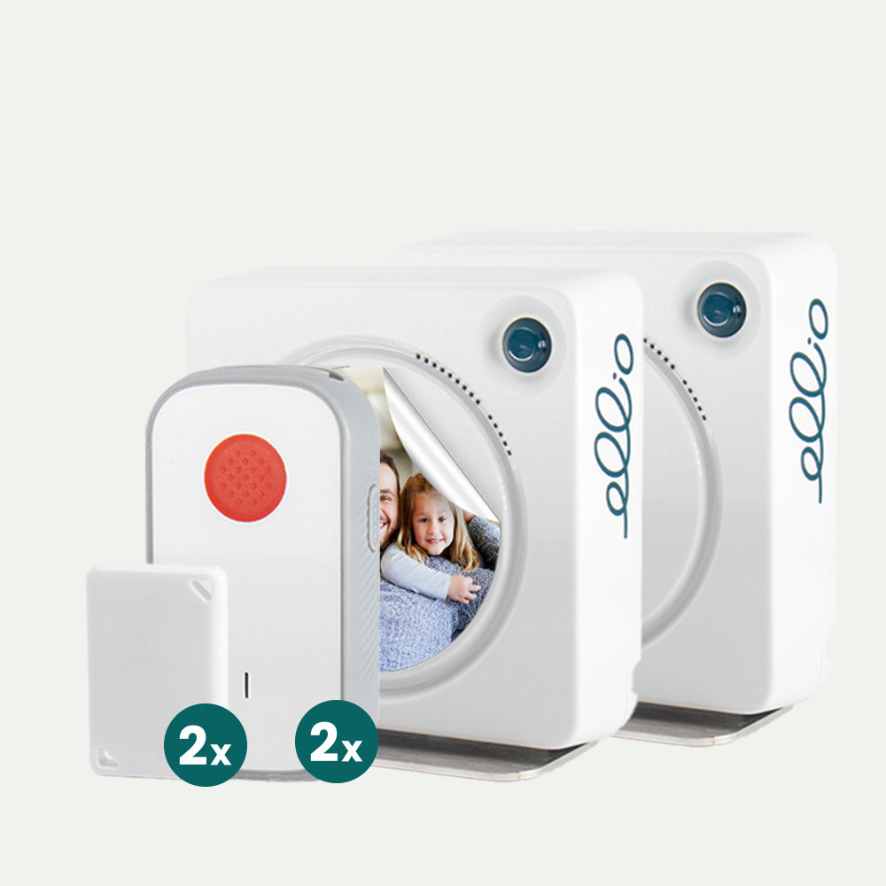Das Aktionspaket umfasst 2x ellio WLAN mit 2x Außer-Haus Schlüsselanhänger und 2x stationäre Notrufknöpfe.